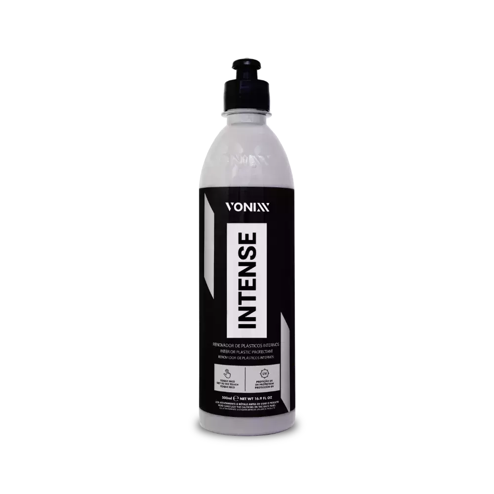 Intense é um renovador de plástico com proteção UV, cuja fórmula balanceada promove acabamento natural e toque seco, com durabilidade de 6 meses. O produto deve ser utilizado especificamente na parte interna do automóvel, em superfícies como vinil e plástico em geral.