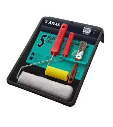Kit de pintura com 5 peças contém: Bandeja de pintura (1523P), trincha 1 1/2 cerdas gris (395/3), rolo espuma amarela 9 cm (406/9), garfo c/ buchas (330/23SR) e rolo de lã de ploliéster de alta densidade de 23 cm (773/19).