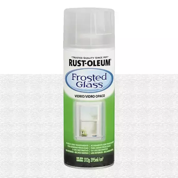Rust-Oleum® Frosted Glass é uma tinta spray que gera um efeito fosco semitransparente em vidros. Indicado para uso em parte interna do vidro da janela, divisórias, clarabóias e vidros em geral.