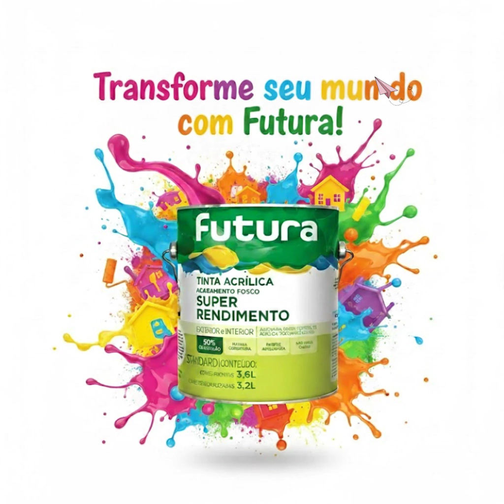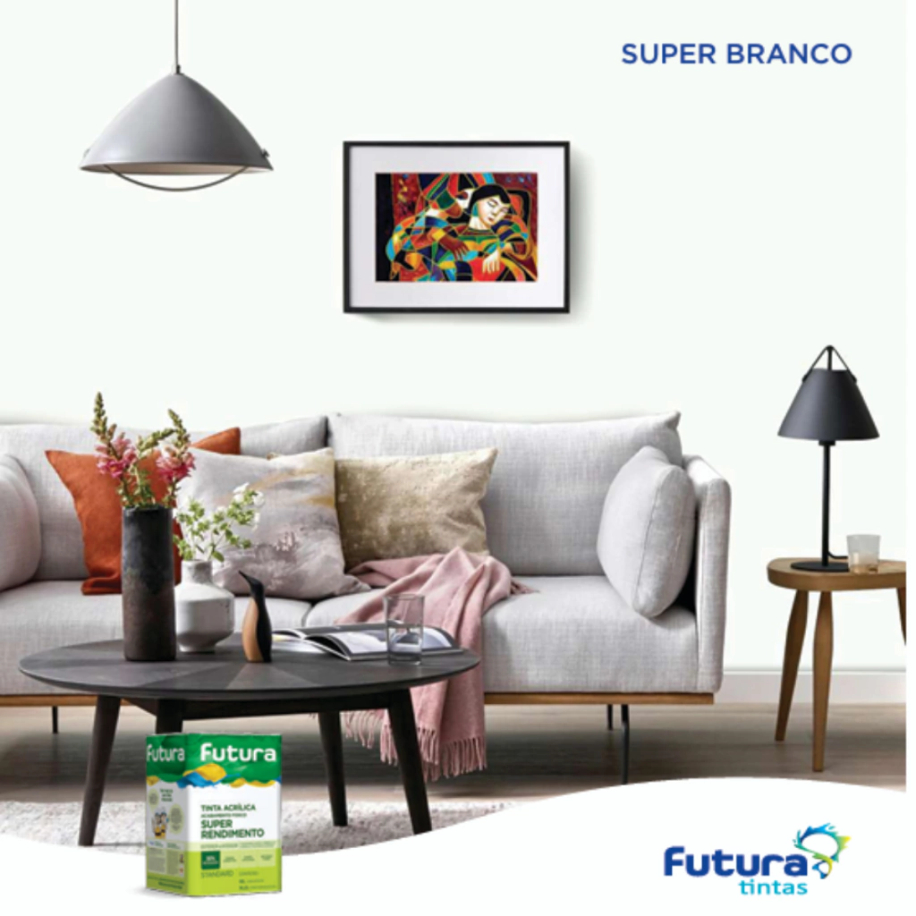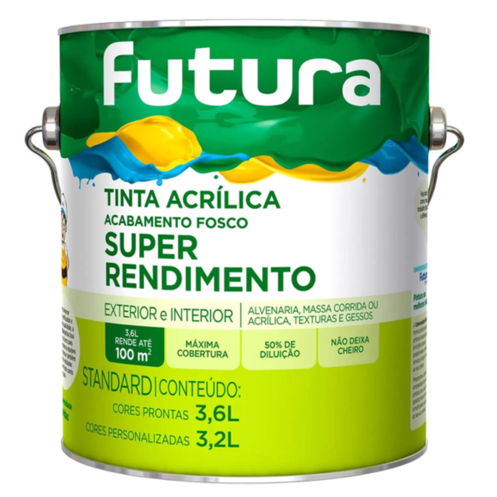 A tinta acrílica Futura Standard é indicada para pintura de superfícies internas e externas, como alvenaria, massa corrida, massa acrílica, gesso, texturas e placas de fibrocimento. Possui acabamento fosco, é formulada à base de látex acrílico e apresenta excelente cobertura, rendimento e facilidade de aplicação. Seu baixo odor permite uso em ambientes habitados, com cheiro desaparecendo após cerca de três horas em locais ventilados.